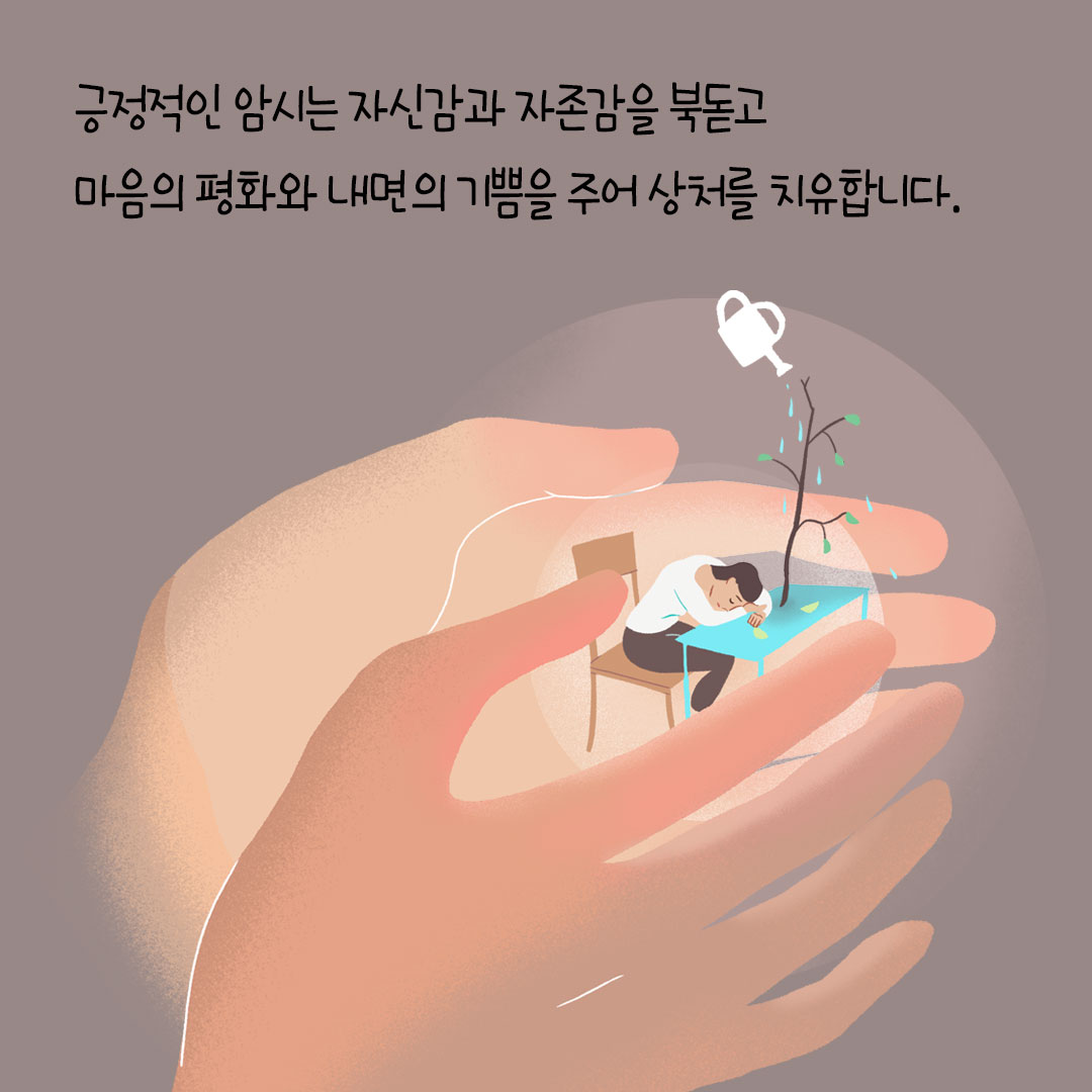 긍정적 암시는 자신감과 자존감을 북돋고 마음의 평화와 내면의 기쁨을 주어 상처를 치유합니다.