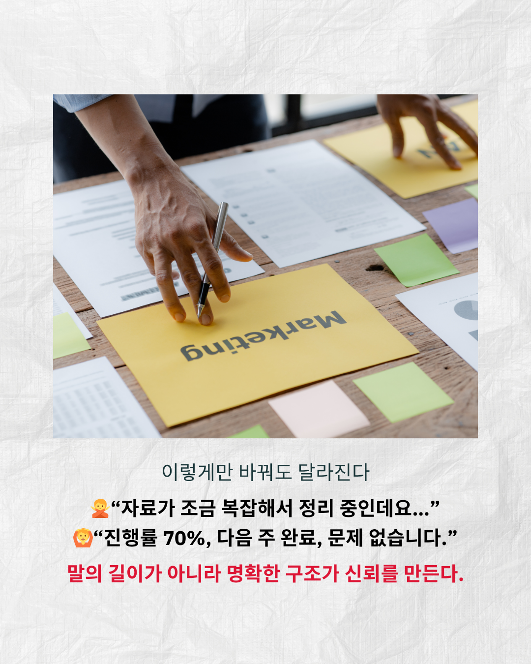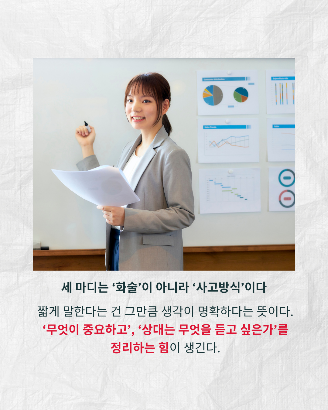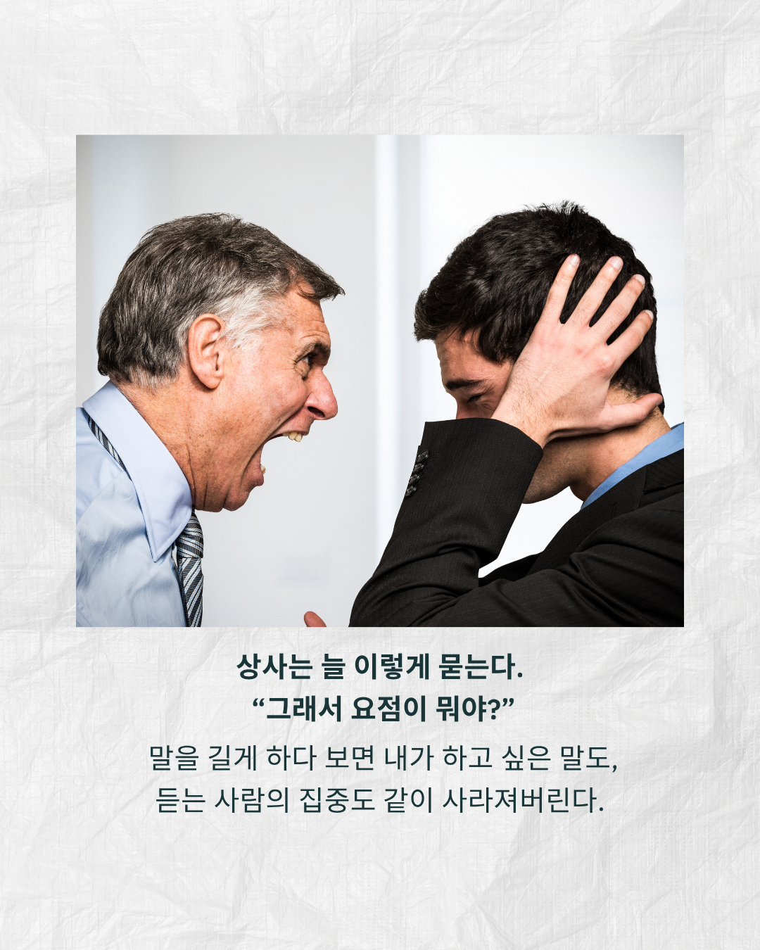 입만 열면 말이 꼬이는 사람들이 있다. 회의에서 논의할 때, 고객에게 제안할 때, 상사에게 보고할 때, 발표할 때… 뭔가를 설명할 상황에서 머릿속 생각은 있는데 말이 바로 나오지 않는다. 반면 어떤 사람은 몇 마디 하지 않았는데 상대를 단번에 이해시킨다. 내용은 짧지만 명확하다.